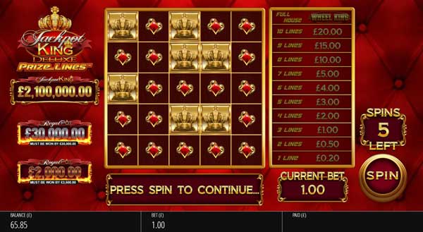 Uma Full House of Prêmio Lines ™ desencadeia o icônico rei das rodas, onde os jogadores podem ganhar um dos três potes disponíveis através do Jackpot King.
